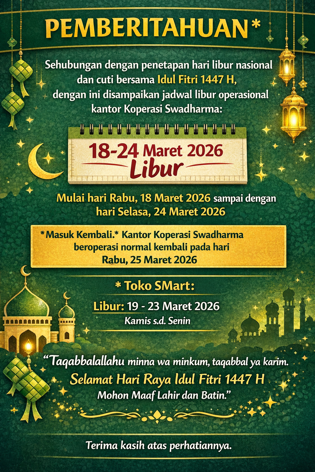 Sehubungan dengan penetapan hari libur nasional dan cuti bersama Idul Fitri 1447 H, dengan ini disampaikan jadwal libur operasional kantor Koperasi Swadharma