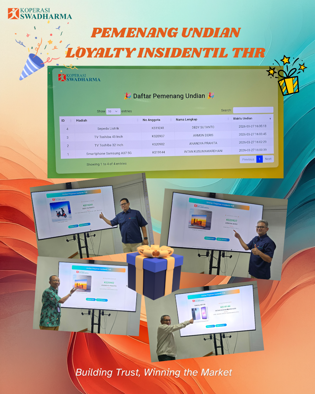 Pada tanggal 26 Februari 2026 berbarengan denga pelaksan Rapat Anggota Tahunan Koperasi Swadharma, telah dilakukan pengundian dan pengumuman pemenang Loyalty Program untuk Anggota dan Peminjam dengan Hadiah berupa Logam Mulia seberat 3gr dan Motor Honda Beat.