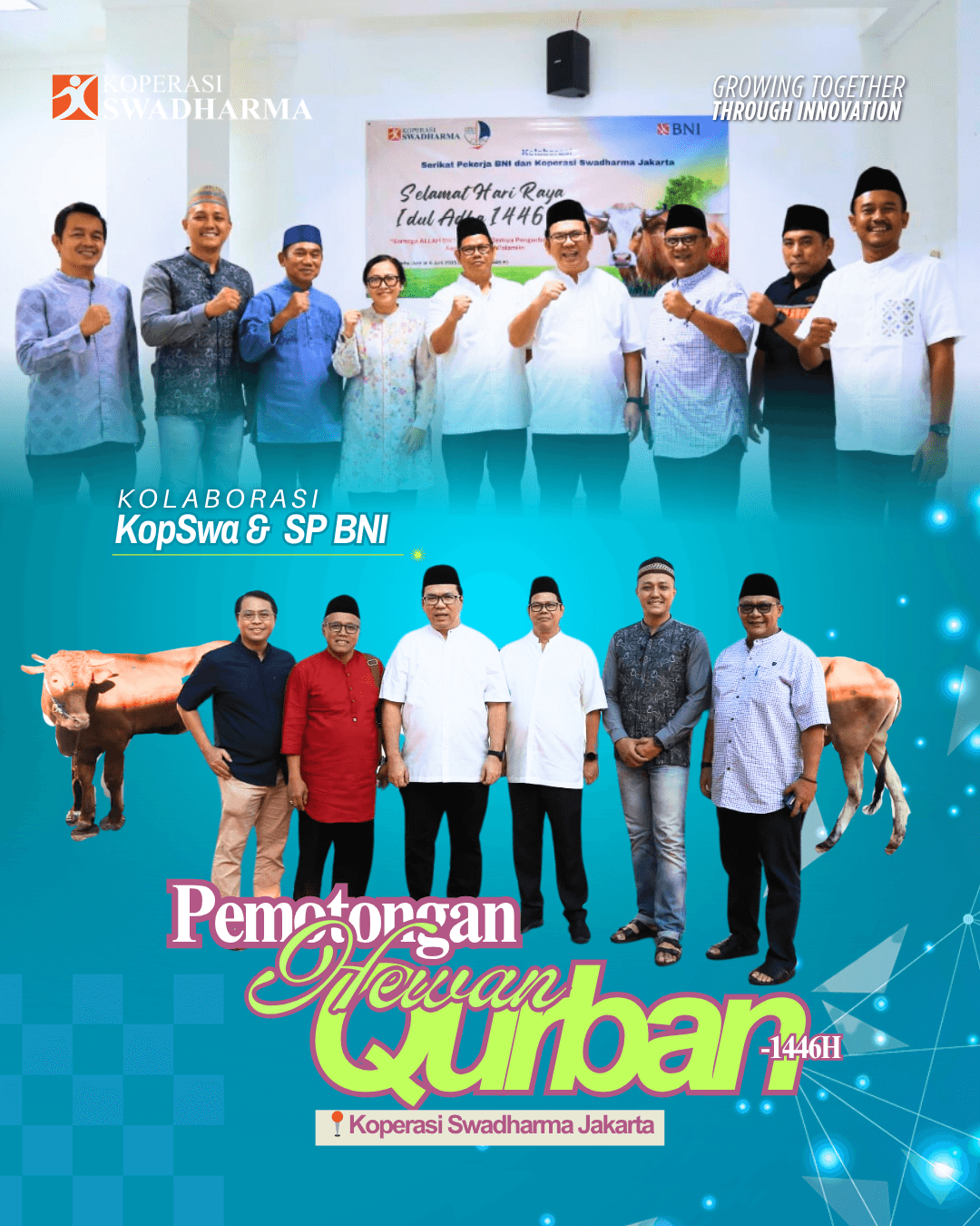 Dalam rangka memperingati Hari Raya Idul Adha 1446 Hijriyah, Koperasi Swadharma Jakarta berkolaborasi dengan Serikat Pekerja PT. Bank Negara Indonesia (Persero) Tbk. mengadakan pemotongan Hewan Qurban sebanyak 2 ekor sapi di lokasi Kantor Koperasi Swadharma Jakarta pada hari Jumat 06 Juni 2025 (10 Dzulhijjah)